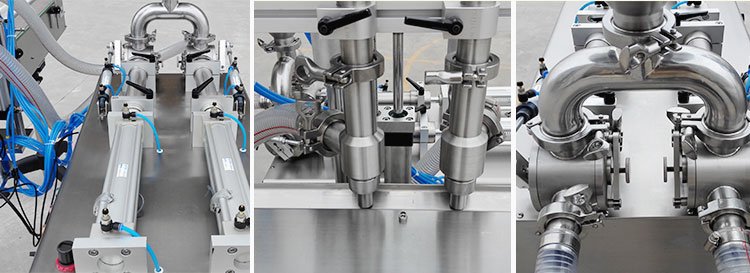 星火包裝機(jī)械之一 雙頭直線式醬料灌裝機(jī),專用于大顆粒的醬料灌裝,解決了以前辣椒醬廠家需要大量人力才能完成灌裝的難題,并且提高了產(chǎn)品的灌裝精度。該機(jī)和物料接觸部位全部采用316L高級(jí)不銹鋼制成,動(dòng)力使用臺(tái)灣亞德客氣缸推動(dòng),整機(jī)干凈大方、動(dòng)力強(qiáng)勁,使很多客戶順利解決了ISO2000和QS認(rèn)證。下圖為機(jī)器部件大圖展示: