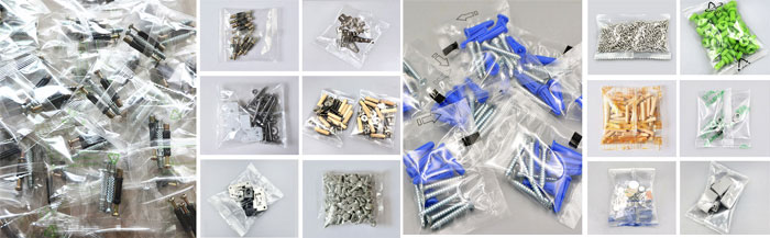 全自動五金件包裝機安裝有自動報警功能。少料、不規則螺絲卡料、空袋或者無料等供料異常時可自動檢測。設備自動停機(避免制作空袋,浪費材料)可以采用三邊封或背封式袋型,(我們建議采用背封式封口,這樣可以方便您的五金件下料,保證五金配件不在制袋器內卡料,做出來的袋子沒有死角,方便穩定,到客戶手上也能方便打開使用)。可隨意設定多種袋長,以滿足不同數量物料包裝(降低耗材成本)可以在已有的震動盤中設置選擇性下料,ABCD四個不同品種順序包裝(專利產品)該設備封口部位及切刀部位安裝有安全保護裝置,以保證操作人員的人身安全。打開防護門即設備自動停機。